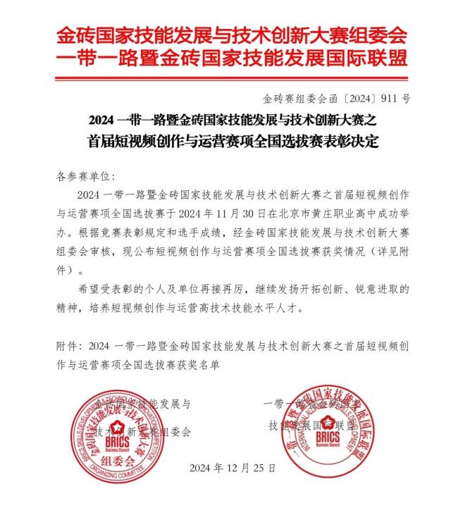 ?在11月30日舉行的2024“一帶一路”暨金磚國家技能發(fā)展與技術(shù)創(chuàng)新大賽之首屆短視頻創(chuàng)作與運(yùn)營全國選拔賽中,分院由李果和鄒珺老師指導(dǎo),參賽團(tuán)隊(duì)由分院學(xué)生肖麗、王悅和涂珍慧組成。選手們憑借獨(dú)特的創(chuàng)意、扎實(shí)的專業(yè)技能和緊密的團(tuán)隊(duì)協(xié)作,從眾多參賽隊(duì)伍中脫穎而出,成功斬獲三等獎,為學(xué)院贏得了榮譽(yù)。