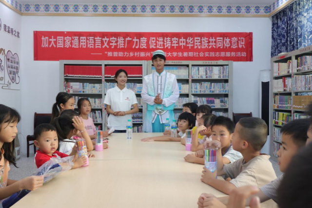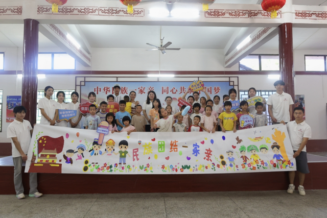 在民族團結育人領域,團隊依托“童話同音”夏令營,結合金坪鄉多民族語言并存的特點,創新設計“普通話正音+方言保護”雙語教學體系。課堂上,苗族孩子用苗語講“山坡上的果樹”,傣族孩子用傣語說“田埂邊的故事”,漢族孩子用方言念“奶奶教的童謠”,再一起學著用標準普通話把這些故事講給彼此聽,通過這種方式,讓9個民族的語言文化在課堂上交融傳承。此外,實踐隊與孩子們共同創作《民族團結一家親》主題長卷畫:畫里有傣族的竹樓、苗族的銀飾,有各族孩子手拉手在果園里歡笑,把語言學習升華為生動的民族團結教育,在畫筆與色彩中,讓“各民族像石榴籽一樣緊緊抱在一起”的理念扎根童心。